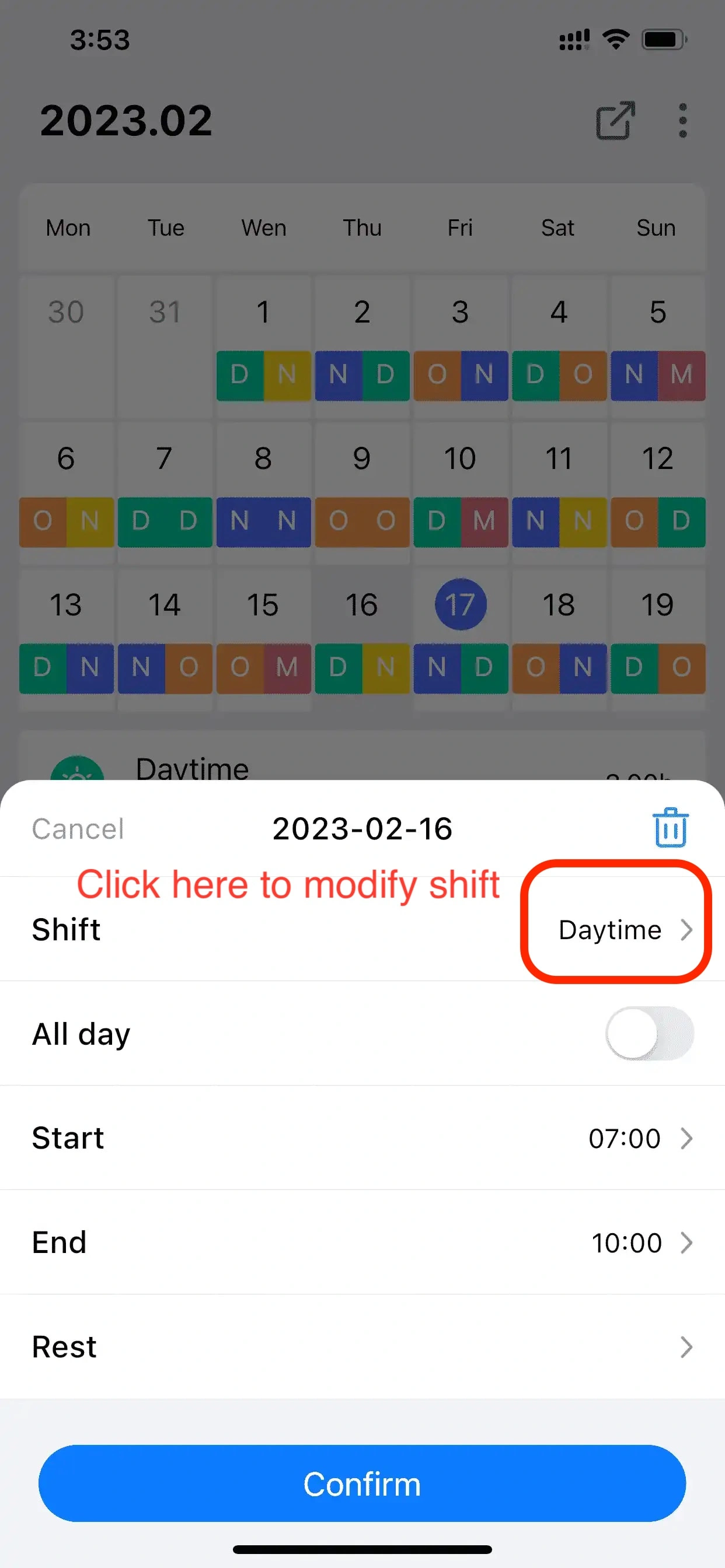 After the Rotation is generated, the actual shift on a certain day has changed, you can click the date that needs to be adjusted in the calendar to modify the required shift;