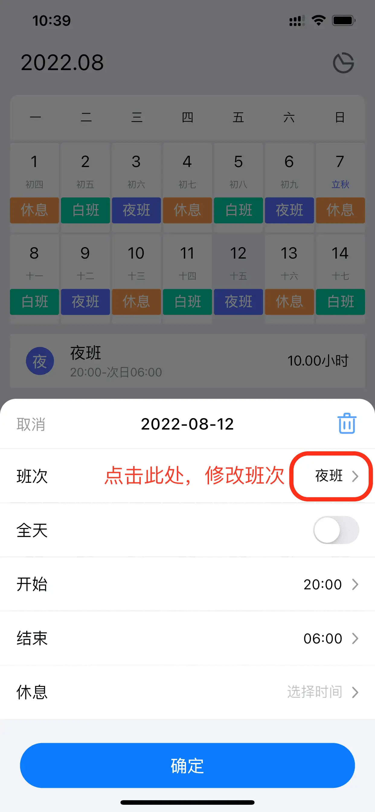 轮班生成后,实际某一天的班次有变化,可以单击日历中需要调整的日期,修改需要的班次;