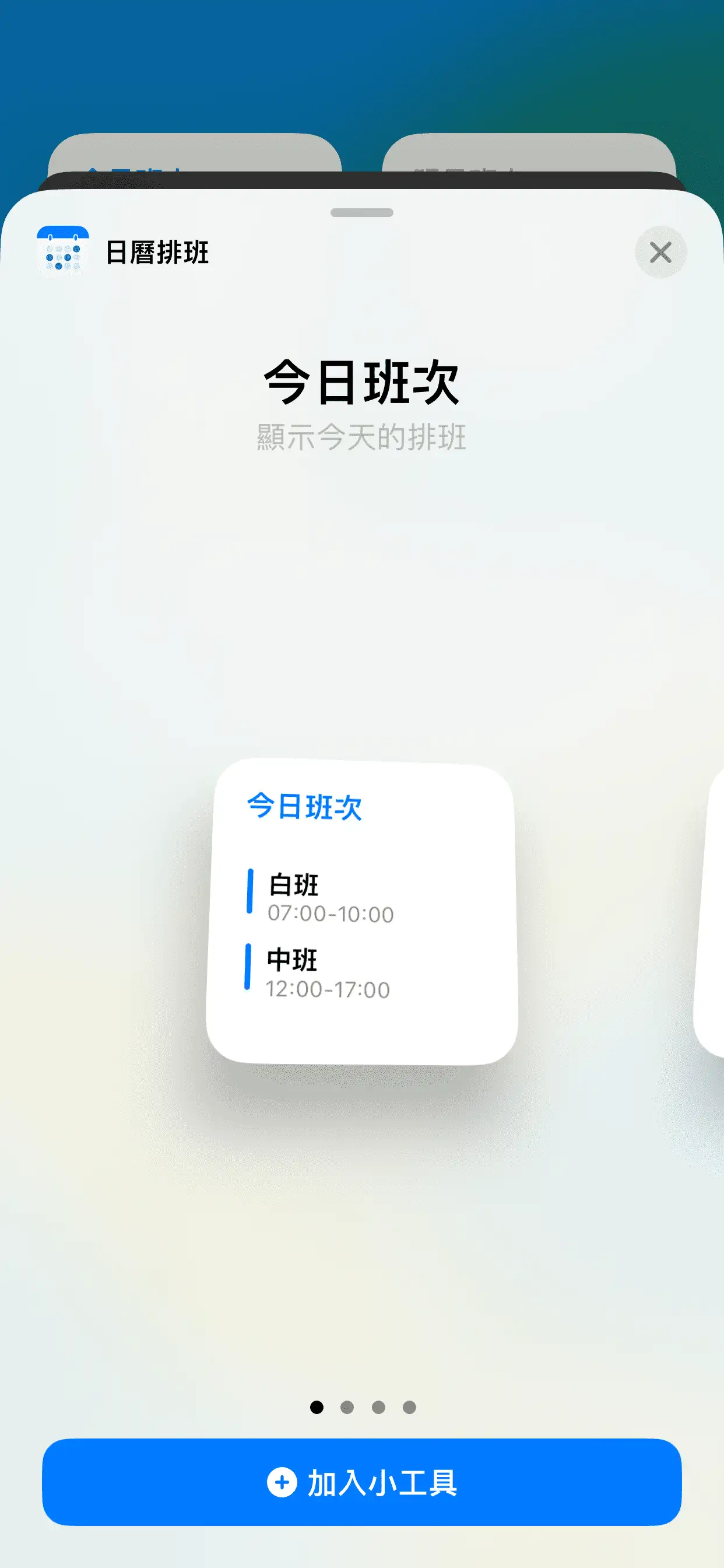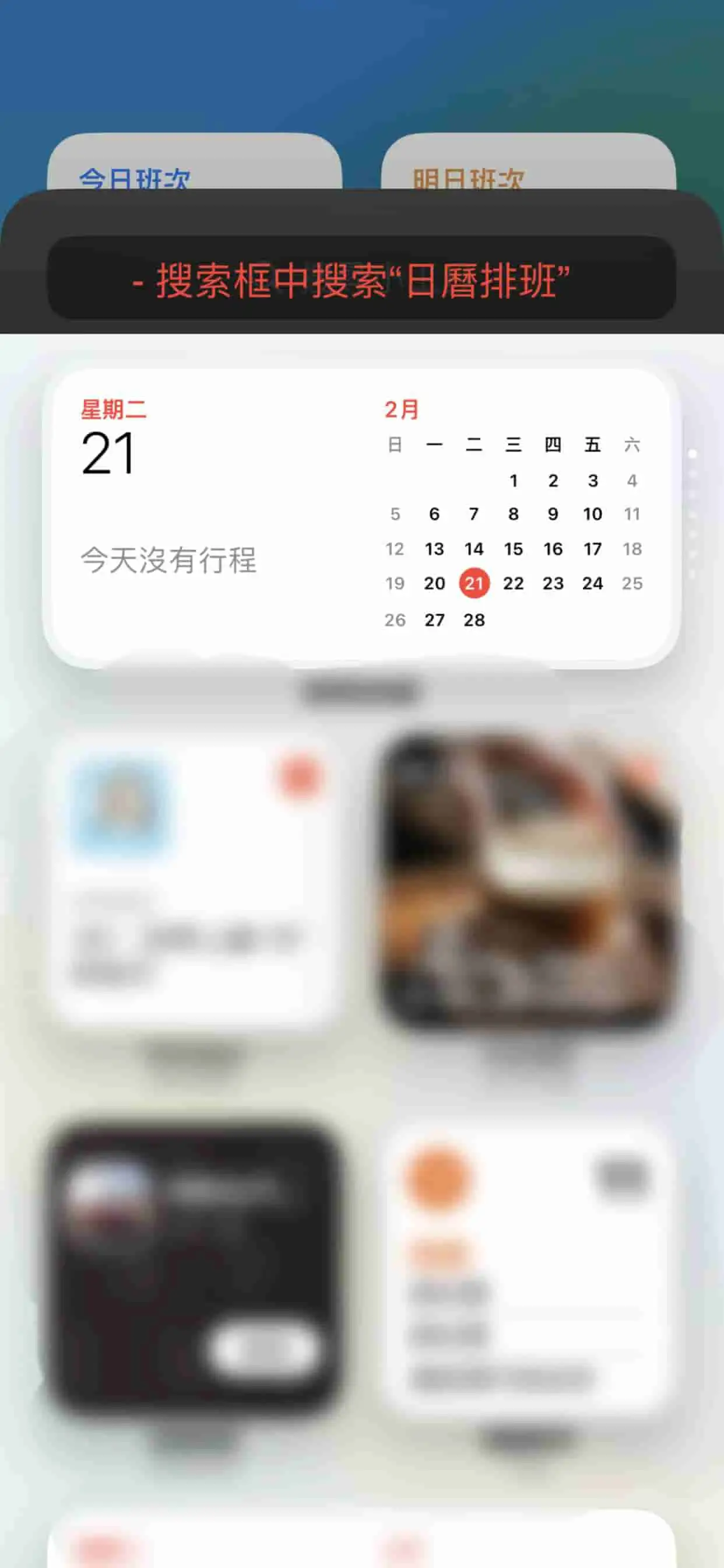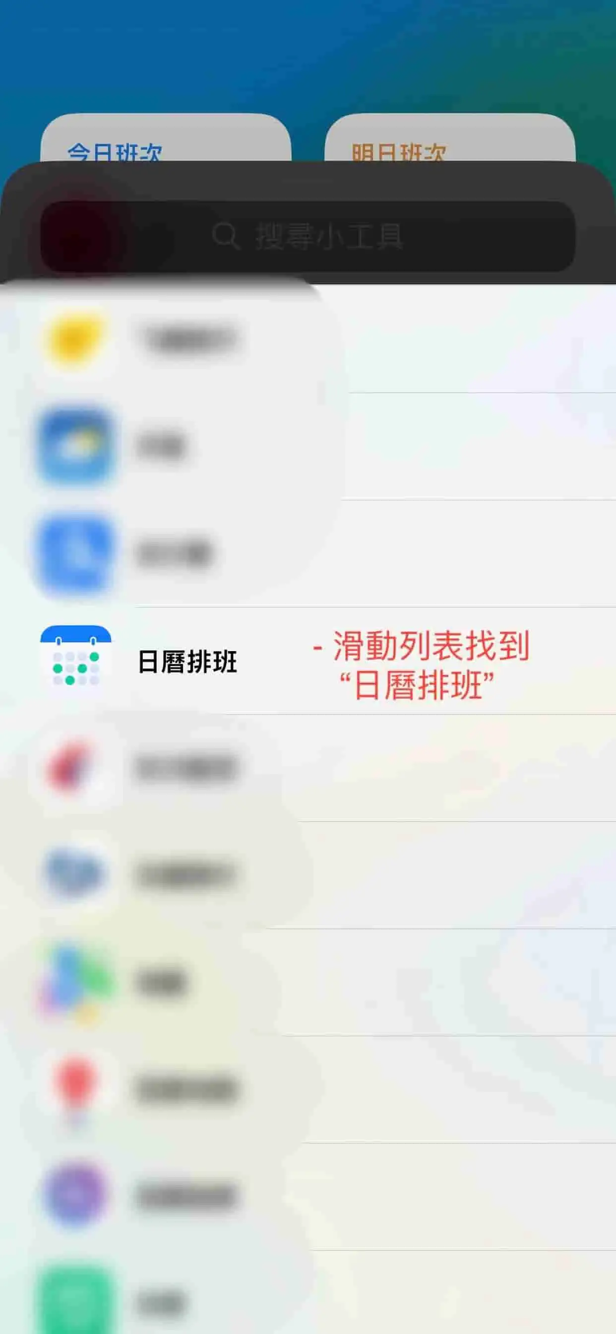 選擇需要的小組件 根據您的需要,選擇合適的小組件。 目前我們提供「今/明日班次」、「周視圖」、「月視圖」