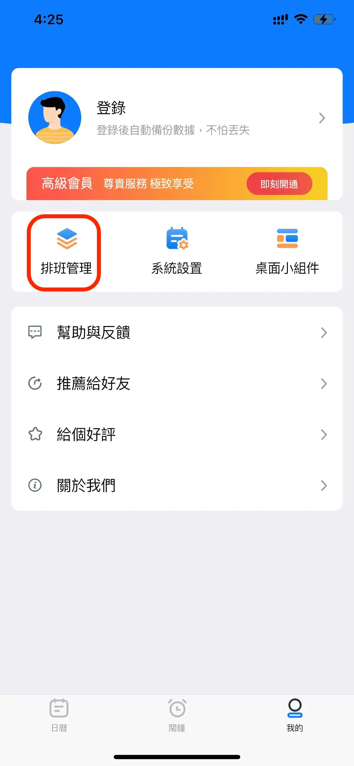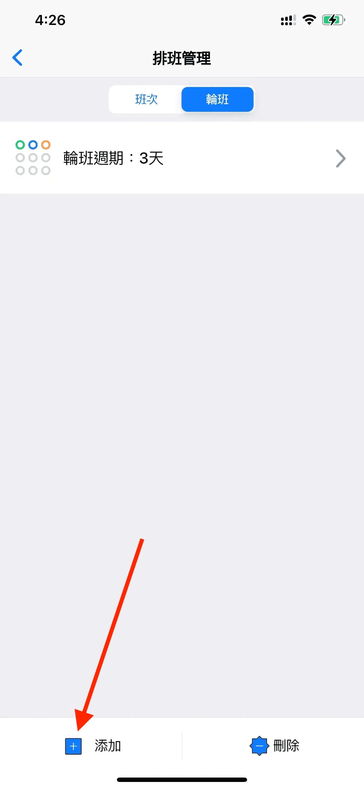 點擊底部『我的』-『排班管理』按鈕,選擇『輪班管理』,點擊左下角的“+”號;