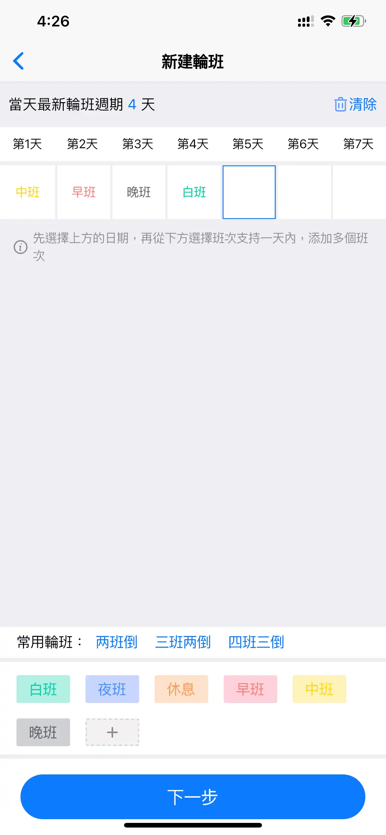 選中第1天,從下方選擇需要的班次,再選第2天,依次操作完成一個週期內的班次安排(如同一天內有多個班次,可再次點擊該班次,填充班次即可);