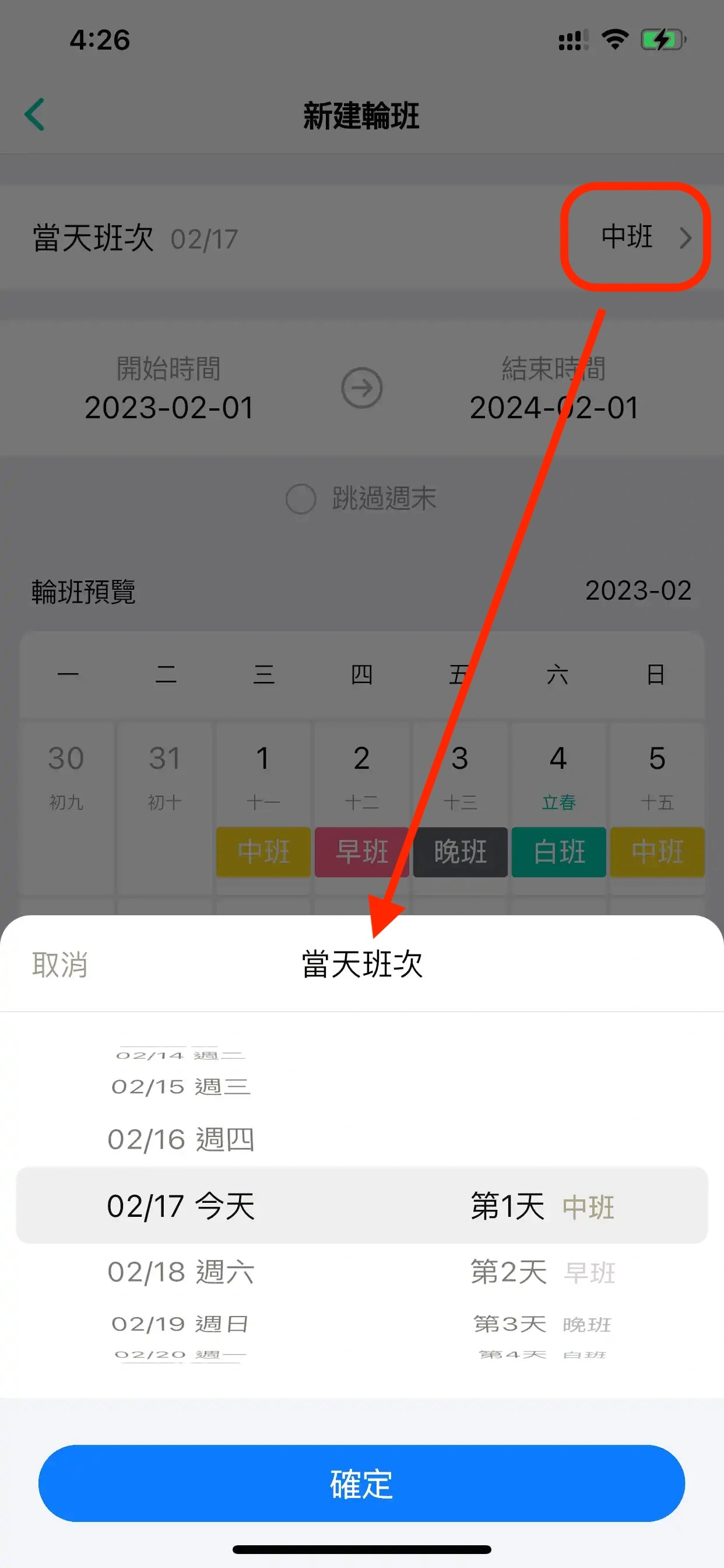 設置當日班次,即今天是輪班週期中的哪個班次。注意這裏也可以選擇其他日期。(左右滑動日期即可改變當前的日期);